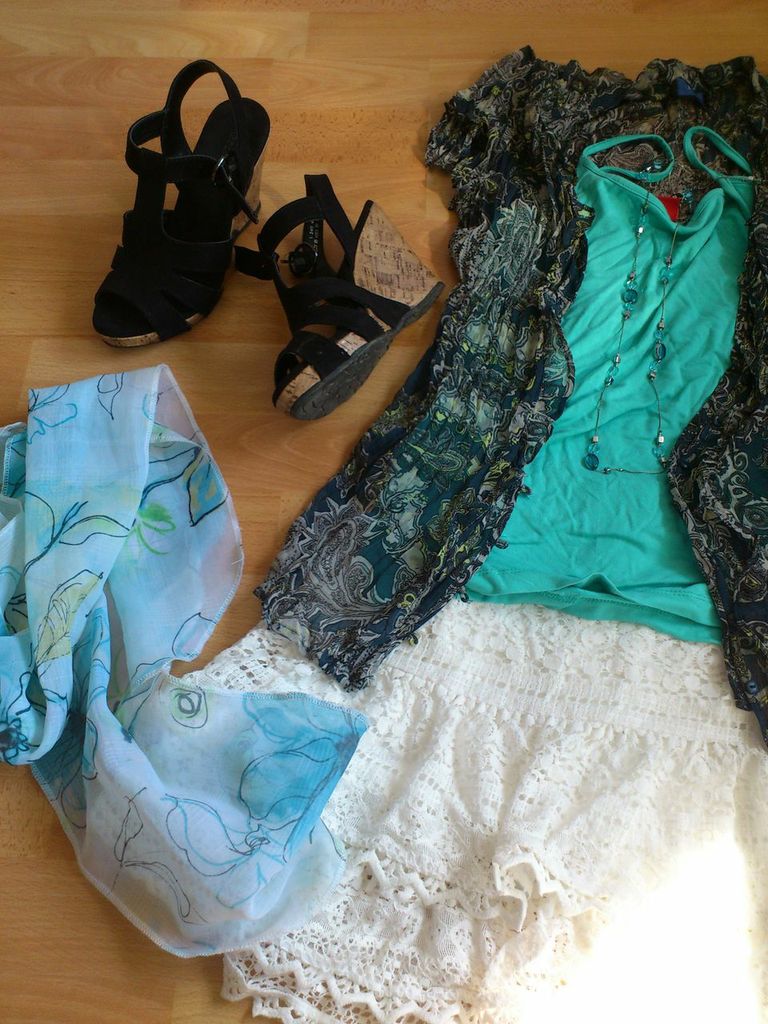 Rock: H&M / Top: Esprit (letztes Jahr) / Weste: Mexx (letztes Jahr) / Sandalen: Deichmann / Schal: Dawanda / Kette: Street One (letztes Jahr) / Nagellack: p2
